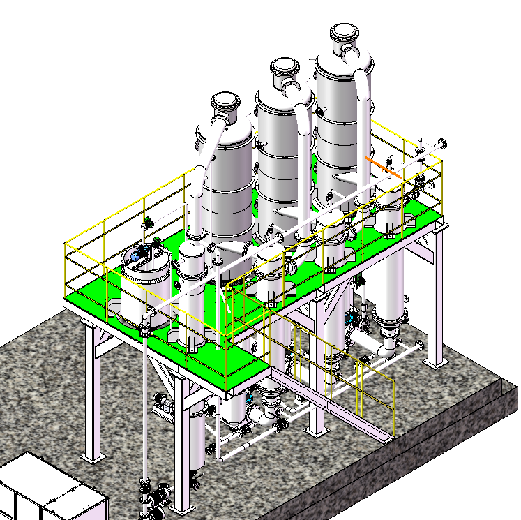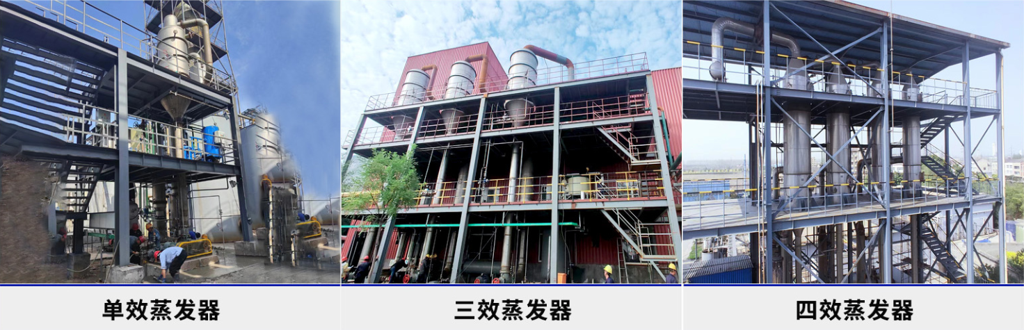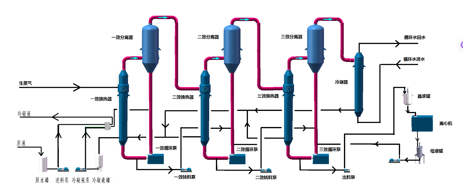 ● 设备由各效蒸发器、分离器、冷凝器、真空及排水系统、各效料液输送泵、操作平台、电器仪表控制柜及阀门、管路组成。